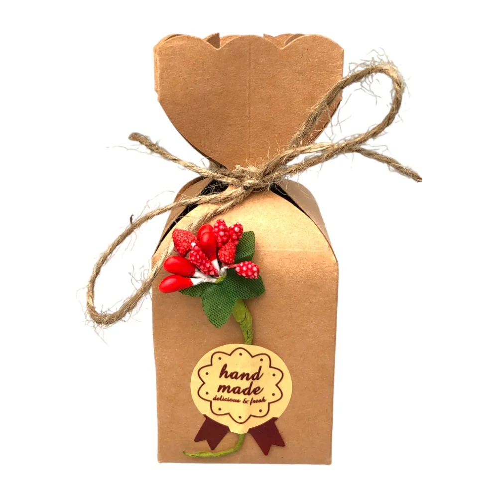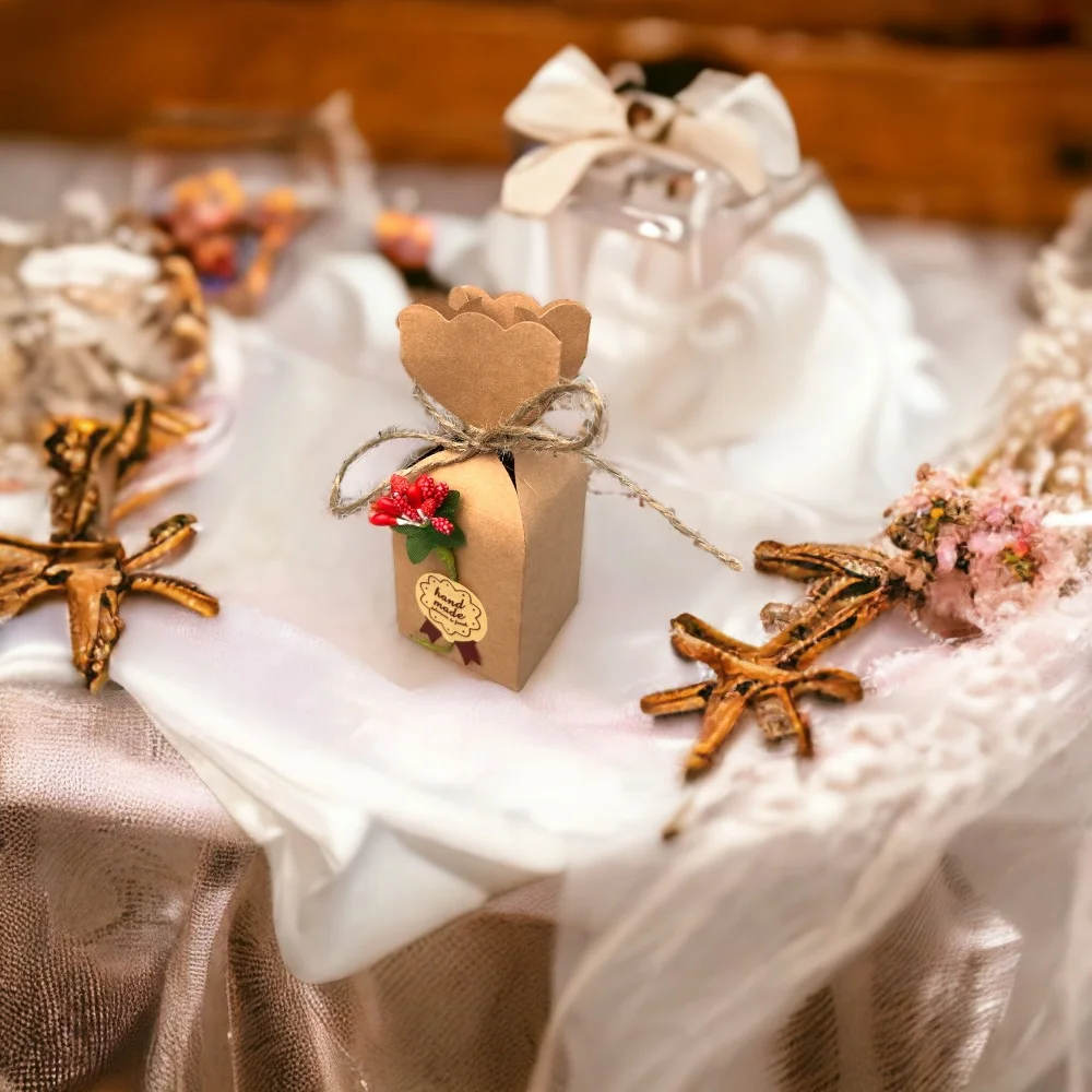 - Vine împreună cu o floare artificială, sfoară elegantă și etichetă.